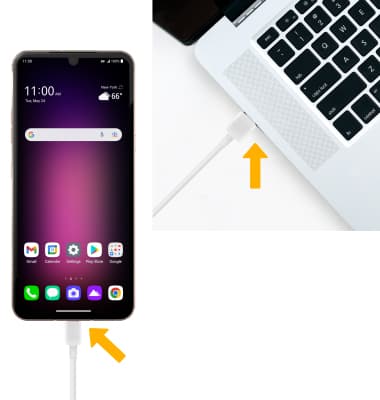 1. With the device powered on, insert the USB-C end of the USB-C cable into the port on the bottom of the device. Insert the USB end of the USB-C cable into an open port on the computer.