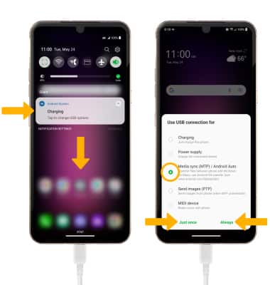 2. To place the device into the correct USB mode, swipe down from the Notification bar then select the Android System Charging notification > Media sync (MTP) / Android Auto > desired option (Just once or Always).