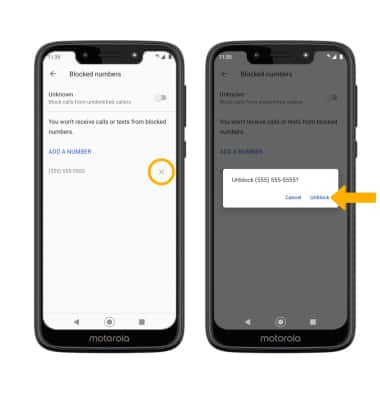UNBLOCK PHONE NUMBER: Select the X icon next to the desired phone number. Select Unblock to confirm.