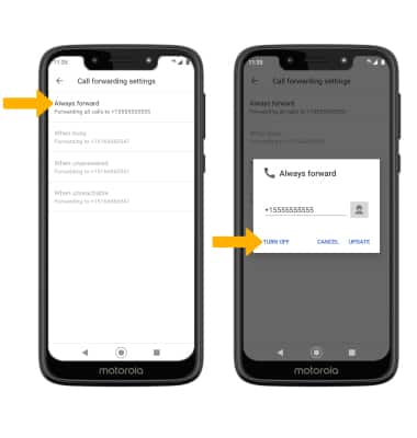 Note: To change the Call forwarding number while Call forwarding is already active, from the Always forward screen edit the phone number then select UPDATE.