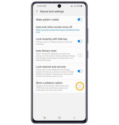 ENABLE: Lockdown mode turns off Smart Lock, biometrics unlock and notifications on the Lock screen. From the Secure lock settings screen, select the Show Lockdown option switch.