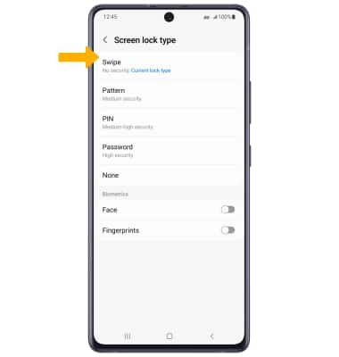 From the Lock screen screen, select Screen lock type > enter your current screen lock > select the new desired screen lock type and follow prompts to complete set up.