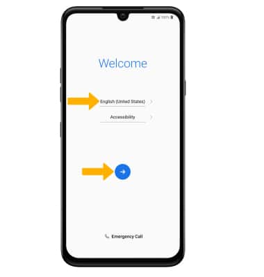 1. When turning the device on for the first time, or after a factory reset, you will be walked through a series of prompts to set up your device. Choose the desired language, then select the Arrow icon to continue.