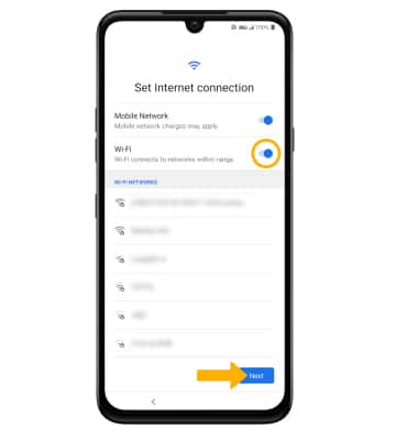 3. If you would like to connect to a Wi-Fi network, select the desired network name and follow the on-screen prompts. Select Next to proceed without connecting to Wi-Fi. Select the Wi-Fi switch to place it in the off position then select Next to continue setup without connecting to a Wi-Fi network and to turn off Wi-Fi to save battery life.