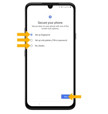8. If you would like to set up your lock screen now, select the desired option and follow the on-screen prompts for setup. To proceed without activating device protection features, select No, thanks. Select Next when finished.