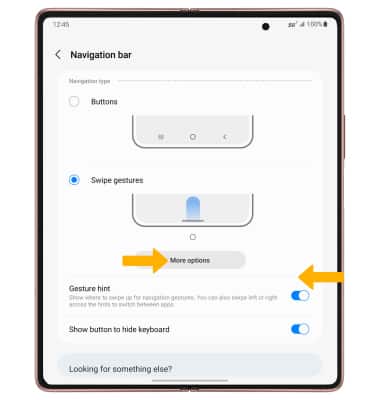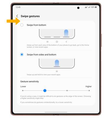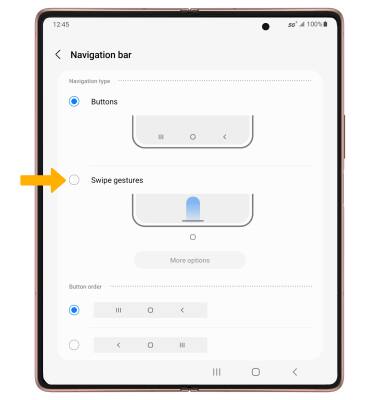 ENABLE: Enabling Swipe gestures allows you to swipe from different areas of the screen to go backwards, forwards, return to the home screen, and see your open apps. From the Navigation bar screen, select Swipe gestures.