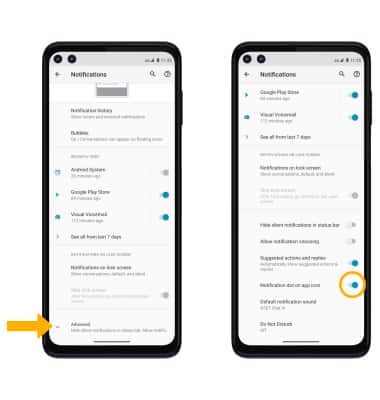 From the Notifications screen, scroll to and select Advanced > Notification dot on app icon switch.
