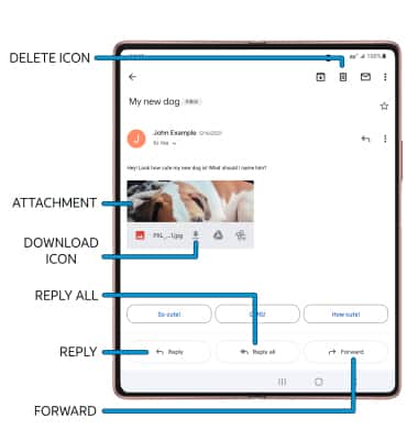 Select Reply, Reply all, or Forward to respond to an email. Select an attachment to view. Select the