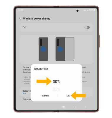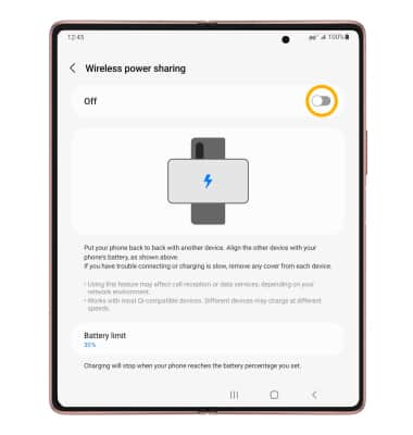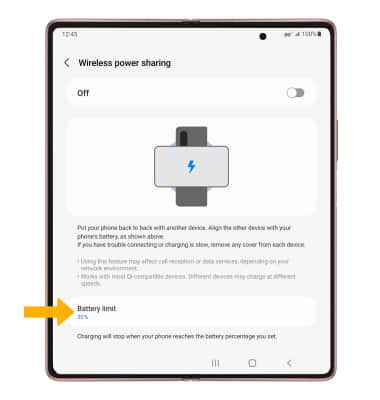 1. Wireless power charging will stop when your phone reaches the battery percentage limit you set. To set a battery limit, from the Wireless power sharing screen, select Battery limit.