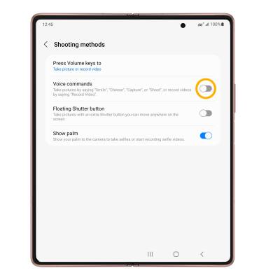 1. Voice commands allows you to take pictures by saying "Smile", "Cheese", "Capture", or "Shoot", or record videos by saying "Record Video". To access voice commands settings, from the Camera settings screen scroll to and select Shooting methods.