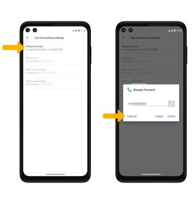 Note: To change the Call forwarding number while Call forwarding is already active, from the Always forward screen edit the number then select UPDATE.
