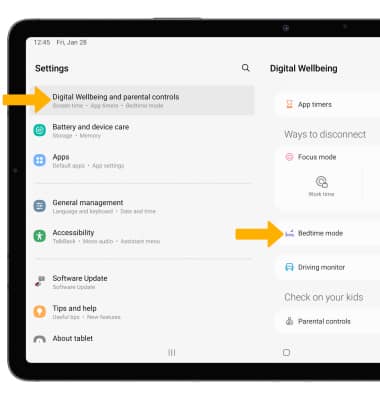 Settings icon. Scroll to and select Digital Wellbeing and parental controls, then scroll to and select Bedtime mode.