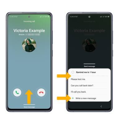 When receiving a call, swipe up from the bottom of the screen to decline a phone call and send a text message. Select the desired text message to send, or select Write a new message to write your own.