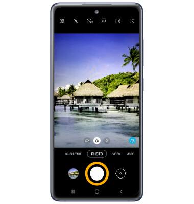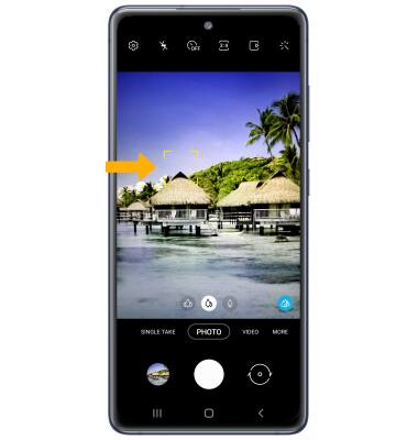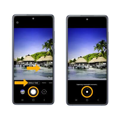 Single Take allows you to shoot a scene in a series of pictures and short videos at the same time. From the camera screen, swipe right to SINGLE TAKE then select the Capture icon to begin recording. Pan the camera around slowly to capture multiple photos in the scene. Single Take will stop automatically after about 10 seconds. To manually stop recording, select the Stop icon. Your device will automatically process all the photos and videos captured.