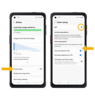 From the Battery screen, select Power saving then select the switch next to the desired power saving option or select the Power saving switch.