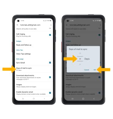 From the Account settings screen, scroll to and select Days of mail to sync. Enter the desired sync preferences, then select OK.