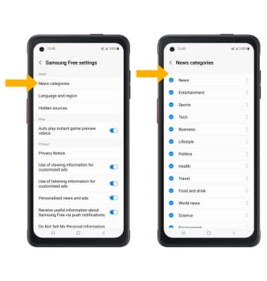 2. Scroll to and select News categories, then select the circle next to the the desired News category option to enable or disable the News category in your Samsung Free app.
