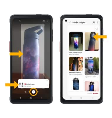 Select the Search icon. Point the device's camera at an object or location. Bixby Vision will automatically identify the object or location. Select Show more results, then select the desired search result.