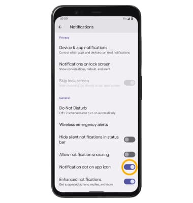 From the Notifications screen, scroll to and select the Notification dot on app icon switch.