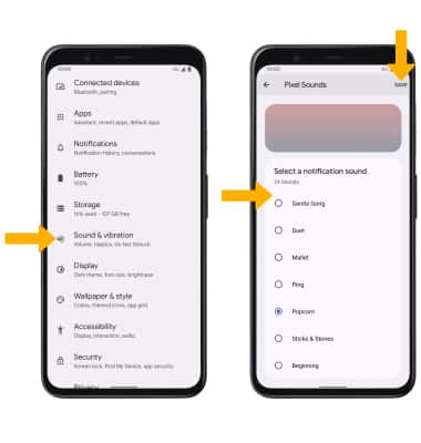 From the Settings screen, select Sound & vibration > scroll to and select Default notification sound > navigate to and select desired sound > select SAVE when finished.