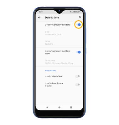 From the Date & time screen, select the Use network-provided time zone switch to disable. Select Time zone > Time zone > desired option.