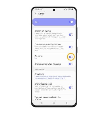 Air view allows you to preview information, extend text, or enlarge pictures by hovering your pen over the screen. From the S Pen settings screen, select the Air view switch.