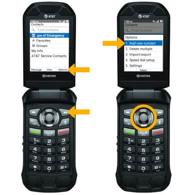 1. From the contacts list, press the right option button to select Options. Press the Select button to select Add new contact.