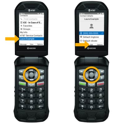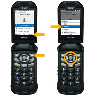 DELETE CONTACT: From the desired contact, press the right option button to select Options. Press the down button to highlight Delete, then press the Select button to select.