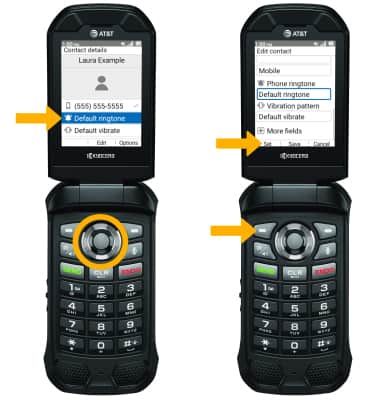 1. From the edit contact screen, press the down button to highlight Default ringtone then press the Select button. Press the left option button to select Set.