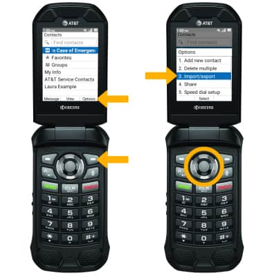 From the Contacts screen, press the right option button to select Options. Press the down button to highlight Import/export. Press the Select button, then follow the prompts.