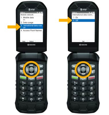 From the Mobile data screen, press the down button to highlight International data roaming then press the Select button to select. Press the up or down button to highlight the desired option, then press the Select button to select.