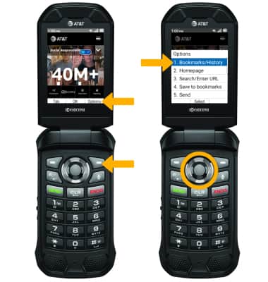1. Press the right option button to select Options. Press the Select button to select Bookmarks/History.