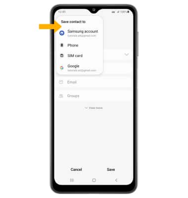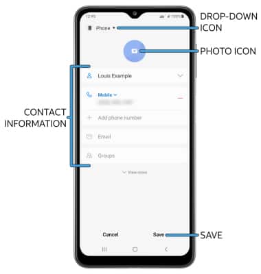 2. Enter the desired contact information in the corresponding fields. Select the drop-down icon to change the desired account you want to save the contact to. To add a picture, select the Photo icon then navigate to the desired image. Select Save when finished.