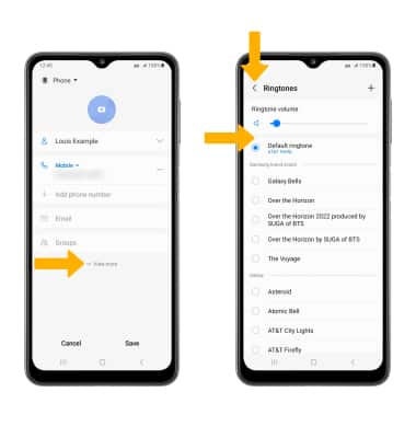 From the edit contact screen, select View more then scroll to and select Ringtone. Select the desired Ringtone, then select the Back arrow.