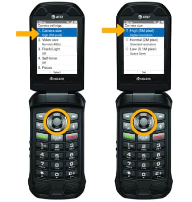 From the Camera settings screen, press the Select button to select Camera size. Press the up or down button to highlight the desired option, then press the Select button to select.