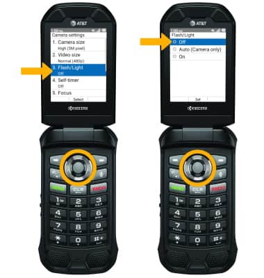 From the Camera settings screen, press the down button to scroll to and highlight Flash/Light then press the Select button. Press the up or down buttons to highlight the desired option, then press the Select button to select.