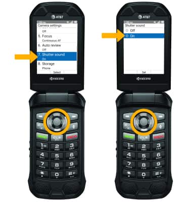 From the Camera settings screen, press the down button to scroll to and highlight Shutter sound then press the Select button. Press the up or down buttons to highlight the desired option, then press the Select button to select.