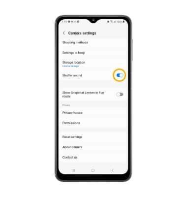 From the Camera settings screen, scroll to and select the Shutter sound switch.