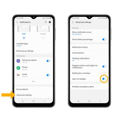 From the Notifications screen, select Advanced settings then select the App icon badges switch to turn notification badges on or off.