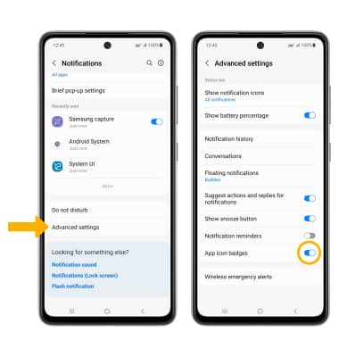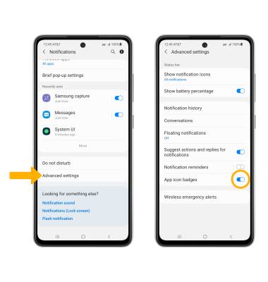 From the Notifications screen, select Advanced settings then select the App icon badges switch to turn notification badges on or off.