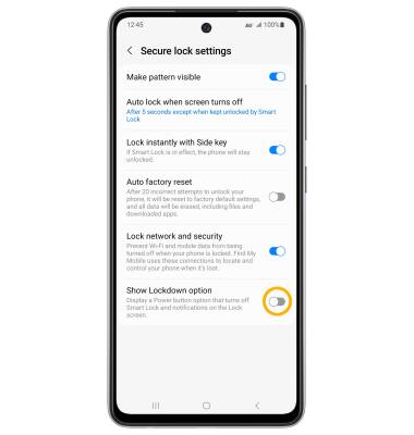 ENABLE: Lockdown mode turns off Smart Lock, biometrics unlock and notifications on the Lock screen. From the Secure lock settings screen, select the Show Lockdown option switch.