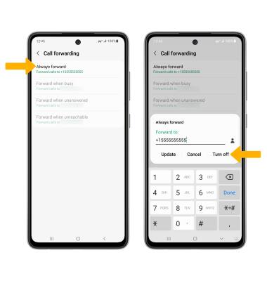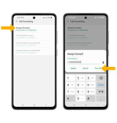 Note: To change the Call forwarding number while Call forwarding is already active, from the Always forward screen, edit the phone number then select Update.
