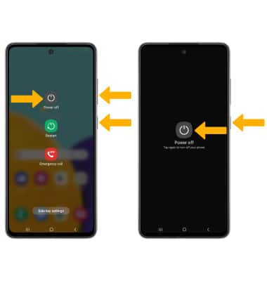 Press and hold the Volume down and Side buttons, then select Power off > Power off. To turn the device back on, press and hold the Side button until the screen lights up.