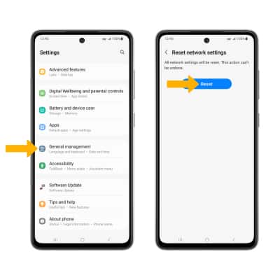 Settings icon > scroll to and select General management > Reset > select Reset network settings > Reset settings > select Reset to confirm.
