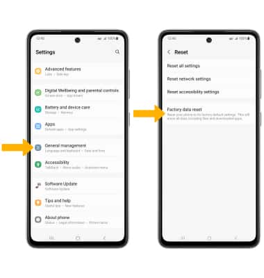 Settings icon > scroll to and select General management > Reset > select Factory data reset.