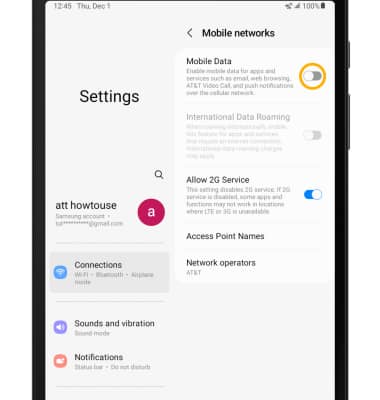 Note: Mobile data is on by default. Turning off mobile data will not allow any data to be transferred over the wireless network. Wi-Fi access, voice function, and standard text messaging are still allowed. You can also turn data on or off by device using your own myAT&T account.