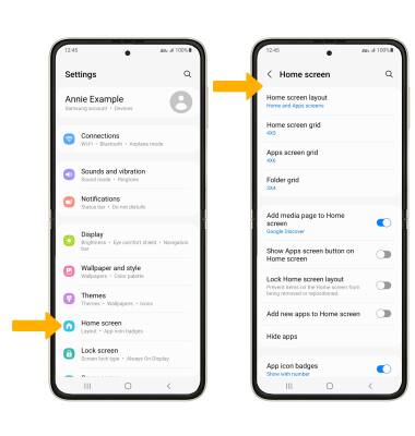 From the Settings screen, scroll to and select Home screen to edit the Home screen grid, App screen grid, and more. Edit Home screen settings as desired.