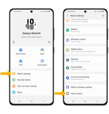 Galaxy Wearable app. Select Watch settings, then scroll to and select About watch.