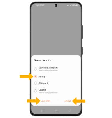 Add icon. Select the desired account you want to save the contact to, then select the desired option (Just once or Always).