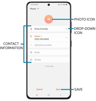 2. Enter the desired contact information in the corresponding fields. Select the drop-down icon to change the desired account you want to save the contact to. To add a picture, select the Photo icon then navigate to the desired image. Select Save when finished.